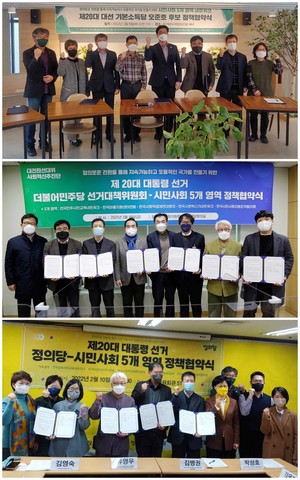 시민사회 5개 영역 전국 네트워크, 3개 정당 대선후보와 '정의로운 전환을 통한 지속가능하고 포용적인 국가'를 위한 정책협약체결