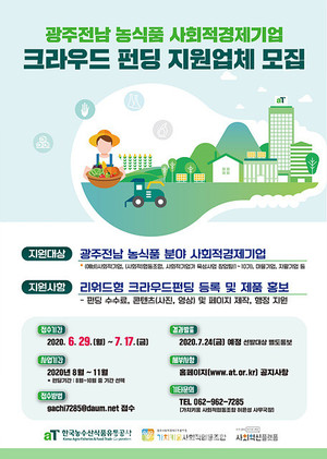 한국농수산식품유통공사(aT,는 "본사가 이전한 광주전남지역의 농식품 분야 사회적경제기업 육성을 위해 크라우드펀딩 지원에 나선다"고 밝혔다.이번 펀딩은 코로나19로 판로개척에 어려움을 겪고 있는 사회적경제기업을 돕기 위해 광주전남지역의 사회적경제기업을 대상으로 이달 17일까지 지원업체를 모집한다. 선발 결과는 24일 발표될 예정이며, 선발자에 한해 별도 통보한다. 모집결과에 따라 최대 15개 업체를 선정해 크라우드펀딩 전문사이트 등록수수료와 제품 홍보를 위한 콘텐츠 제작 등을 지원할 예정이다.또한 목표금액 펀딩에 성공한 기업에는 10