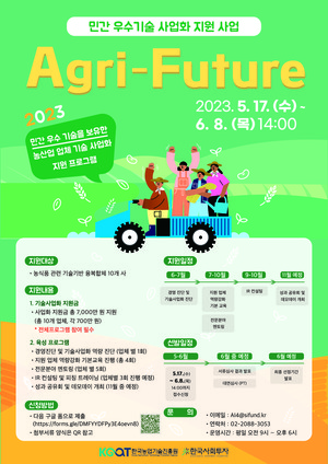 한국사회투자와 한국농업기술진흥원이 우수 기술을 보유한 농산업 분야 기업을 육성하기 위해 '2023년 민간 우수기술 사업화 지원사업 Agri-Future(애그리퓨처)' 참여 업체를 모집한다.모집 대상은 농업 관련 기술기반 농산업체이며, 총 10개 기업을 선정한다. 한국사회투자와 한국농업기술진흥원은 애그리퓨처 사업을 통해 우수 기술을 보유한 농산업체를 선정하고, 팀별 맞춤형 기술사업화 지원 프로그램을 제공할 예정이다.선정된 업체에는 16주 동안 총 7,000만 원(총 10개 팀, 각 700만 원)의 기술사업화 지원금, 지원 업체의 기술