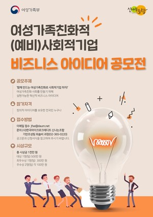여성가족부와 (사)한국마이크로크레디트 신나는조합은 여성의 일·생활 균형 지원, 다양한 가족의 삶의 질 향상 등을 실현할 수 있는 '여성가족친화 사회적기업 비즈니스 아이디어 공모전'을 개최한다. 공모는 ▲경력단절 여성 취․창업 ▲다문화 가족 정착 지원 및 다문화 여성 사회 참여 확대 ▲청소년 자립지원 ▲여성 안전 강화 및 범죄예방 등 여성․가족․청소년 분야의 사회적 목적을 달성하기 위하여 활동하는 개인이나 기업으로, 향후 여성가족형 (예비)사회적기업으로 발전 가능성이 있는 곳을 대상으로 한다.이번 공모전은 총 4팀을 선정하여 최대 5