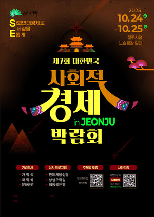 대한민국 사회적경제(사회연대경제)의 현재와 미래를 한눈에 볼 수 있는 '제7회 대한민국 사회적경제 박람회 in 전주'(이하 박람회)가 오는 10월 24일부터 25일까지 전주시청 노송광장 일대에서 열린다. 이번 박람회는 '사회연대경제로 세상을 이롭게'를 슬로건으로 내걸고, 사회연대경제의 가치 확산과 지역·시민이 함께하는 연대의 장을 마련한다는 목표로 진행된다. 민간주도에서 민관협력으로 - 협력의 새로운 모델올해 박람회는 지난해 국회에서 민간 주도로 개최된 제6회 박람회의 성과를 이어받아, 민간과 전주시가 공동주체로 참여한다는 점에서