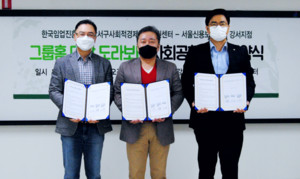 서울 강서구의 취약계층 돌봄을 위한 강서구사회적경제통합지원센터, 한국임업진흥원, 서울신용보증재단 강서지점 세 기관의 협약식이 진행됐다.3일 오전 서울 강서구사회적경제통합지원센터에서 '강서구 사회적경제와 한국임업진흥원, 서울신용보증재단 강서지점이 함께 하는 그룹홈 대상 도라보니 사회공헌사업 협약식'(MOU)이 진행됐다. '도라보니'는 강서구 사회적경제기업들이 연대하여 만든 강서구 사회적경제 돌봄 사업 브랜드다.이번에 추진하는 사회공헌사업은 강서구 사회적경제 활성화 및 공공부문의 사회적 가치 실현을 위해 강서구사회적경제통합지원센터와 한