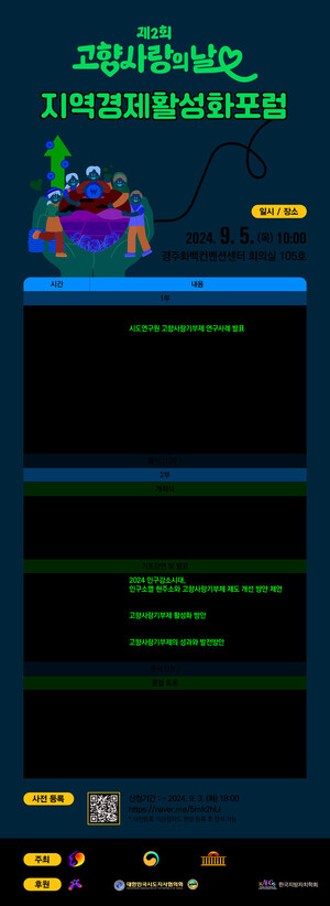 한국지방행정연구원은 오는 5일 경주화백컨벤션센터에서 '제2회 고향사랑의 날 기념 지역경제활성화포럼'을 개최한다고 밝혔다.이번 행사는 행정안전부와 이만희·한병도 국회의원이 공동으로 주최하고, 대통령 직속 지방시대위원회와 대한민국시도지사협의회, 대한민국시장군수구청장협의회, 한국지방자치학회가 후원해 개최된다.이번 포럼은 약 100명의 지방자치단체 공무원과 유관기관 관계자 및 전문가를 대상으로 '제2회 고향사랑의 날'을 기념해 고향사랑 기부제 1년의 성과를 돌아보고, 고향사랑 기부제를 통한 지역경제 활성화 방안을 모색하기 위해 마련됐으며,