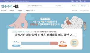 서울시가 '공공기관 화장실 비상용 생리대 비치'에 대한 시민 의견을 수렴하는 투표를 '민주주의 서울'에서 6월 19일부터 7월 18일까지 한 달간 진행한다. '민주주의 서울'은 시민이 직접 서울시 정책을 제안-투표-결정하는 온라인 시민 제안 창구로 이곳에선 시민들이 오프라인으로 제안한 정책들도 안건으로 올려 시민들의 의견을 수렴한다. 이번 '공공기관 화장실 비상용 생리대 비치'는 그동안 시민들이 지속적으로 요청했던 사안으로 국내외에 관련 사례가 있다. 2016년 일부 저소득층