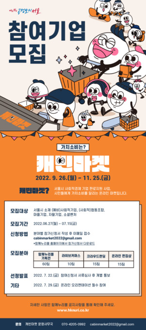 서울시는 오는 9월~11월 온라인 기획전 ‘가치소비는? 캐빈마켓’을 개최한다. 이와 관련해 오는 7월 15일(금)까지 ‘캐빈마켓’에 참여할 사회적경제기업 100팀을 모집한다고 밝혔다.‘캐빈마켓’은 서울시 대표 사회적경제쇼핑몰인 ‘함께누리몰(hknuri.co.kr)’내에서 열린다. 사회적경제 콘텐츠 플랫폼 ‘캐빈닷넷’의 인기 캐릭터 캐빈에서 이름을 따왔으며, 기획전 곳곳에 이 캐릭터를 사용해 쇼핑의 재미를 높일 예정이다.최근 MZ세대의 관심이 높은 가치소비 확산을 위해 서울시가 기획한 것으로, 상품의 할인판매 및 크라우드펀딩, 라이브