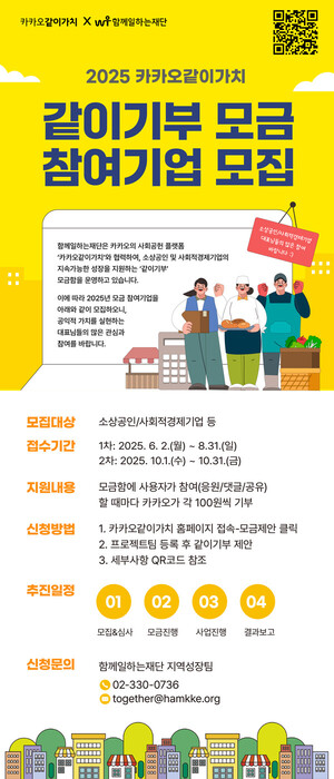 함께일하는재단이 카카오의 사회공헌 플랫폼 '카카오같이가치'와 협력해 소상공인 및 사회적경제기업의 지속가능한 성장을 지원하는 '같이기부 모금함' 참여기업을 모집한다.이번 모집은 두 차례에 걸쳐 진행되며, 1차 모집은 6월 2일부터 8월 31일까지, 2차 모집은 10월 1일부터 10월 31일까지 진행된다. 모집 대상은 소상공인 및 사회적경제기업 등이다.'같이기부 모금함'은 카카오같이가치 플랫폼을 통해 시민들의 참여를 유도하는 방식으로 운영된다. 사용자가 모금함에 응원, 댓글, 공유 등의 활동을 할 때마다 카카오는 각 100원씩 기부금을
