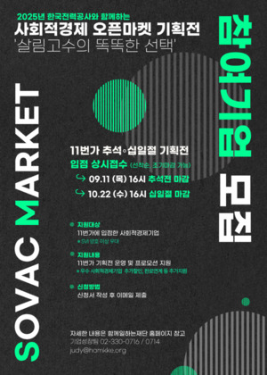 (재)함께일하는재단이 한국전력공사와 함께 오는 추석과 연말을 맞아 사회연대경제기업의 판로 확대를 지원하는 '11번가 온라인 기획전'을 진행한다.이번 기획전은 사회연대경제기업의 제품을 시민들에게 소개하고, 할인쿠폰(25~40%) 제공 등 소비자 참여를 유도하는 다양한 온·오프라인 판로지원 프로그램을 포함하고 있다. 모집은 추석과 10월 말까지 이어지는 두 차례 기획전으로 나눠 진행된다. 신청은 상시 접수되며, 추석 기획전은 9월 11일 오후 4시까지, 연말 기획전은 10월 22일 오후 4시까지 마감된다. 신청은 선착순 모집으로 조기