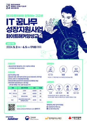 현대오토에버와 함께일하는재단이 'IT 꿈나무 성장지원 사업'의 고교생 참가자를 모집한다. 이 프로그램을 통해 화이트해커 등 정보보안 분야의 인재 양성에 나설 계획이다. 오는 6월 5일까지 참가자를 모집하며, 서류 심사와 AI 면접 심사를 통해 참가자를 선발한다. 현대오토에버가 주최하고 함께일하는재단이 주관하는 IT 꿈나무 성장지원 사업은 올해 7년째 진행되는 사업이다. 올해는 정보보안 전문가(화이트해커)로 성장을 꿈꾸는 전국 소재 고등학교 재학생 50명을 선발하여 4개월간 화이트해커 양성 교육을 제공한다.IT 꿈나무 성장지원 사업은