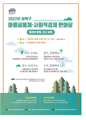 서울시 성북구가 '2022 성북구 마을공동체 사회적경제 한마당'을 오는 21일 한성대입구역 분수마루 일대에서 연다. 성북구 마을공동체 사회적경제 한마당은 구민이 흥겨운 분위기에서 마을공동체와 사회적경제를 이해하고 다양한 체험을 즐기기 위해 마련한 축제다.'열려라 함께, 다시 같이'라는 제목을 붙인 이번 행사는 지역 내 공동체 확산과 사회적경제의 지속적 성장을 도모한다. 마을공동체와 마을기업, 사회적기업, 협동조합 등 21개 마을공동체 및 사회적경제 조직이 참여해 다양한 부스를 설치하고 체험 기회를 제공한다. 그 중 7개 단체는 행사