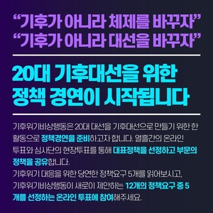"기후가 아니라 체제를 바꾸자"기후위기비상행동에서 20대 대선을 기후 위기에 대응하는 대선으로 만들기 위해서, 정책경연 온라인 투표를 진행한다. 12월 1일부터 10일까지 열흘간 https://bit.ly/2ZzAjPA 에서 참여할 수 있다. 대표정책은 기후위기비상행동에서 정한 '당연한 요구' 다섯 가지에, '새롭고 과감한 요구' 중 온라인 투표로 결정된 다섯 가지를 더해 선정할 예정이다. 당연한 요구▲ 국가 온실가스 감축목표 (재)상향 ▲ 탄소성장법 폐기와 기후정의법 제정 ▲ 재생에너지 보급, 탈석탄과 내연기관차 전환 목표 재설정