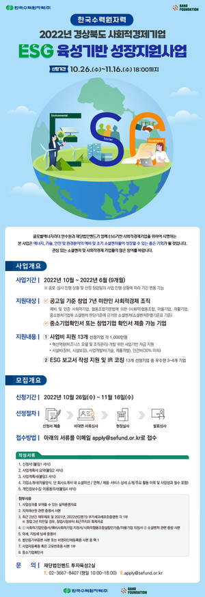 ESG 경영 기반을 갖춘 사회적경제 기업을 발굴하고, 지원을 통해 기업의 ESG 성과평가와 성과관리 역량을 강화하기 위한 지원 사업을 시행한다.한국수력원자력과 재단법인밴드가 함께 시작하는 '경상북도 사회적경제 기업 ESG 육성 기반 성장지원사업'은, ESG 평가 지표를 보유하고 관리하는 초기 사회적경제 기업과 소셜벤처들의 성장 기회를 마련하는 것을 목표로 한다. 창업 7년 미만의 경상북도에 소재한 사회적경제 조직((예비)사회적기업, (사회적)협동조합, 마을기업, 자활기업, 소셜벤처)이 참여 가능하며, 중소기업 확인서 또는 창업기업