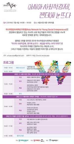 세계적으로 화두가 되고 있는 '젠더(성) 불평등'을 사회적경제 관점에서 해결하고 변화시키고 있는 아시아 8개국 청년사회혁신가 15명이 서울에 모인다. 서울시는 다음달 4일 오후 2시 시청 다목적홀에서 '2018 아시아 청년 사회혁신가 국제포럼'을 한겨레신문사 주관으로 개최한다고 25일 밝혔다. 올해로 5회째를 맞이하는 이번 포럼은 '아시아 사회적경제 젠더에 눈뜨다'를 주제로 진행된다. 사회적경제 관점의 접근을 통해 성 불평등과 차별을 해소하고 다양성을 확보해 사회문제 해결의 새로운 가능성을