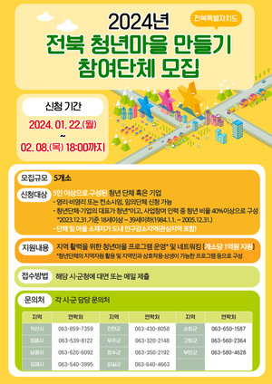 전북특별자치도는 지역에 활기를 불어넣고, 청년들의 지역 정착을 유도하기 위한 2024년 '전북 청년마을 만들기 사업'에 참여할 청년단체를 1월 22일부터 2월 8일까지 모집한다.'전북 청년마을 만들기 사업'은 지역 특색에 맞는 청년마을을 발굴해 지역과 상생하는 활동 프로그램, 지역과의 교류·협력 등을 지원하는 사업으로, 2022년부터 추진해 15개 청년마을을 지원했다.올해는 총 5개 청년마을을 선정해 개소당 1억 원을 지원한다.신청 대상은 도내에서 활동하는 5인 이상으로 구성된 청년단체 또는 기업으로, 대표가 청년(18세 이상 39
