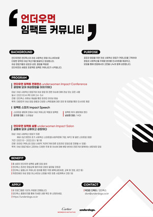 국내·외 혁신 창업가를 발굴하고 육성하며 창업 전반을 지원하는 창업교육 기업인 언더독스에서 '언더우먼 임팩트 커뮤니티'를 론칭한다. 2018년부터 언더독스가 진행한 여성 창업교육 프로그램 '언더우먼'은 결혼과 육아 등으로 경력이 중단된 3040 여성이 자신의 역량과 사회혁신 관점을 바탕으로 창업가로 성장할 수 있도록 돕기 위해 시작됐다. 이번 언더우먼 임팩트 커뮤니티는 소셜 임팩트를 추구하는 초기 단계의 여성 창업가를 지원하는 글로벌 프로그램 까르띠에 여성 창업 이니셔티브의 후원을 통해 진행 대상을 기혼 여성에서 2040 전체 여성으로 새롭게 확장하고, 여성 사회혁신 창업가를 위한 컨퍼런스와 커뮤니티 프로그램까지 확대하여 진행된다.