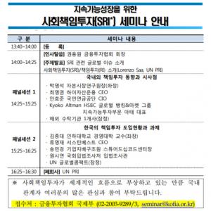 국내외 사회책임투자(SRI)와 책임투자(RI) 동향을 점검하며 국내 사회책임투자 확산 방안을 찾기 위한 자리가 마련된다.한국금융투자협회는 국제연합(UN) 산하 책임투자원칙 기구(PRI·Principles for Responsible Investment)와 오는 18일 오후 2시 서울 여의도 금융투자협회 3층 불스홀에서 '지속가능성장을 위한 사회책임투자(Social Responsible Investment) 투자세미나'를 개최한다고 4일 밝혔다. 세미나는 주제발표와 패널토론으로 구성된다. 먼저 로렌조 사(Lorenzo
