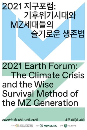 기후위기 시대, 20~30대 MZ세대의 슬기로운 생존법을 찾는 시리즈 포럼 '2021 지구포럼'이 열린다. 일상에서 실천할 수 있는 기후위기 대응 방법부터 지구를 지키는 취업과 창업 등 기후 문제에 관심이 있는 청년들이 현실적인 고민을 나누고 사회적경제와 연계하는 해법을 찾는 자리다. 서울시사회적경제지원센터와 ㈜먹스킹은 다음달 6일부터 20일까지 매주 토요일, 세 차례에 걸쳐 ‘지구포럼’을 연다. MZ세대 관점에서 ▲효과적이고 재미있는 활동과 캠페인 ▲소비생활의 전환 ▲기후위기 대응 일자리 경험 ▲기후위기 대응 비즈니스 창업의 명과