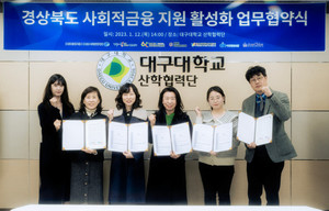 경상북도 사회적경제지원센터와 재단법인 밴드는 12일 대구대학교 산학협력단에서 '경상북도 사회적금융 지원 활성화 업무협약'을 체결했다.이번 협약은 도내 사회적경제기업에게 사회적금융을 지원하고, 경상북도 사회혁신기금의 원활한 운영을 위해 체결했다.이날 협약식에는 경상북도 사회적경제지원센터 원희철 센터장, 재단법인 밴드 김선영 이사 외 도내 사회적경제기업 3개사가 참여했다. 특히 업무협약식에서는 재단법인 밴드와 도내 사회적경제기업과 총 4300만 원의 사회혁신기금 대출 약정체결도 이뤄졌다. 대출 체결이 이뤄진 기업은 지난해 '경북 사회적