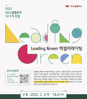 사단법인 더좋은세상 피피엘은 LG소셜캠퍼스가 2월 18일까지 환경 분야를 이끌어갈 LG소셜펠로우 12-1기 참가 기업을 모집한다고 10일 밝혔다.LG소셜캠퍼스는 사회적경제기업, 벤처기업의 성장을 위해 LG전자·LG화학이 고려대학교 안암캠퍼스에 조성한 친환경 소셜 복합 공간 겸 사회적경제 통합 지원 플랫폼이다.선정된 LG소셜펠로우 12-1기 기업에는 최대 5000만 원을 지원하며 리딩그린(Leading Green) 액셀러레이팅을 통해 친환경 사회적경제기업으로 성장할 발판을 마련한다.리딩그린 액셀러레이팅은 합동 컨설팅 및 개별 맞춤형