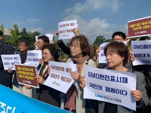 46개 소비자·농민·환경단체들로 구성된 'GMO반대전국행동(이하 전국행동)'가 GMO표시제 이행과, 사회적 협의회 중단에 따른 정부 책임을 촉구하며 8일 청와대 앞 광장에서 기자회견을 개최했다. '행동하는 소비자의 정원'과 소비자, 학생, 생산자도 지난 1일 같은장소에서 정부와 관련부처의 책임있는 대책을 촉구하는 기자회견을 진행한바 있다.GMO완전표시제는 ▲생태 다양성 ▲건강한 식탁 ▲국민의 알 권리를 충족하기 위한 국민들의 최소한의 요구다. 또한 ▲미승인 LMO(Living Modified Organi