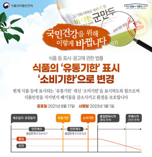 식품의약품안전처가 2023년부터 유통기한 표시제를 없애고 소비기한만 표시하기로 했다. 다만, 우유 등 유통과정에서 변질이 우려되는 일부 품목은 2031년까지 시행이 유예된다. '유통기한'이 제조일로부터 소비자에게 판매를 허용하는 기한이라면, '소비기한'은 섭취 시 안전에 문제가 없는 기한이다. 소비기한은 식품이 품질을 유지할 수 있는 기한에 0.8~0.9 정도의 안전계수를 곱해 산정한다.'유통기한'이란 유통을 할 수 있는 기간으로 유통업체가 소비자에게 판매를 해도 되는 법적 기한을 뜻한다.미국, 유럽, 일본, 중국 등을 포함해 소비