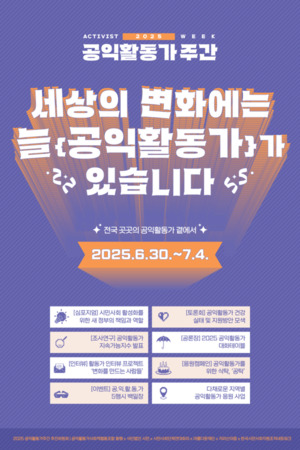 "세상의 변화에는 늘 공익활동가가 있습니다."공익활동가들의 노력을 조명하고 사회적 지지를 확산하기 위한 '2025 공익활동가 주간'이 오는 6월 30일부터 7월 4일까지 닷새간 전국 각지에서 개최된다. 공익활동가 사회적협동조합 동행, 사단법인 시민, 한국시민사회지원조직네트워크, 사회적협동조합 지리산이음, 아름다운재단, 시민사회단체연대회의 등 주요 시민사회 단체들은 '2025 공익활동가 주간 추진위원회(이하 추진위원회)'를 구성해 이번 행사를 공동 개최한다고 밝혔다.