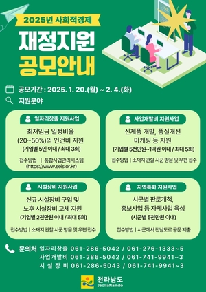 전라남도가 오는 2월 4일까지 지역 사회연대경제기업(사회적경제기업)의 지속적이고 안정적인 성장과 자립 강화를 지원하는 '2025년 사회적경제기업 재정지원사업' 공모에 나선다.공모를 통해 일자리 창출 지원, 사업 개발비 지원, 시군 지역 특화사업 지원, 시설 장비 지원 등 4개 분야로 나눠 총 160여 곳의 사회연대경제기업에 총 사업비 27억 원을 지원할 예정이다.최근 정부의 사회연대경제 정책이 '획일적 육성'에서 '자생력 제고'로 전환함에 따라 사회적기업의 노동자 인건비를 지원하는 일자리 창출 지원사업의 국비 지원이 2025년부터