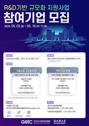 경기도사회적경제원이 'R&D(연구개발) 기반 규모화 지원사업' 참여기업 20곳을 16일까지 모집한다.이번 사업은 사회문제 해결을 위한 혁신기술 기반의 제품 및 서비스를 보유한 사회연대경제 조직의 안정적 성장을 지원하기 위해 마련됐다. ▲기술사업 고도화 ▲TIPS(민간투자주도형 기술창업지원) 도전 집중형 등 두 부분으로 나눠 참여기업을 모집한다. 운영기관으로는 주식회사 다래전략사업화센터가 협력한다. '기술사업 고도화' 부문에 선정된 기업은 ▲(10개소)기술진단 컨설팅을 통한 사업화 전략 수립 ▲(5개소)시작품 제작·실험 지원을 위한