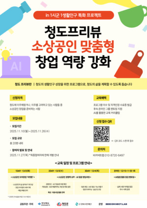 경북시민재단은 지난 10일부터 '1시군 1생활인구 특화 프로젝트' 사업의 일환으로 '청도프리뷰 - 소상공인 맞춤형 창업 AI 역량 강화 교육 프로그램'을 시작했다. 이번 사업은 경상북도와 청도군, 경북시민재단이 공동 주최·주관하고 민간 지역연구소 ㈜비커넥트랩이 운영을 맡는다.이번 사업은 청도로 이주했거나, 이주를 고려중인 49세 미만 청년을 대상으로 참여자를 모집하고 있다. '청도프리뷰'는 청도군의 생활인구 성장을 지원하고, 청도에서의 삶을 구체적으로 설계해볼 수 있도록 마련된 사업이다. '청도프리뷰 - 소상공인 맞춤형 창업 AI