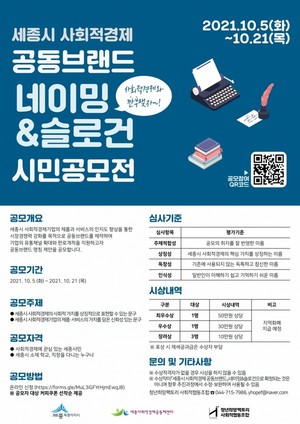 세종특별자치시(이하 세종시)가 사회적경제 인지도 향상과 판로개척 지원 확대를 위해 '세종시 사회적경제 공동브랜드' 개발에 나선다. 세종시는 세종시만의 사회적경제 가치를 담아 공동브랜드를 구축하고 관내 사회적경제기업과의 공동마케팅으로 사회적경제 활성화를 꾀할 계획이다. 세종시는 사회적경제 공동브랜드 개발을 시작으로 오는 21일까지 '네이밍&슬로건 시민공모'에 나선다. 공모신청자는 지역적 특색과 사회적 가치의 상징성을 담아 구성한 응모작을 세종시 홈페이지 공지사항에 안내된 주소로 접속해 신청하면 된다. 세종시는 응모작을 대상으로 공정한