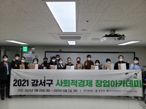 '강서구 사회적경제 창업아카데미' 데모데이와 수료식이 진행됐다.강서구사회적경제통합지원센터는 2일 센터 강의실에서 '2021년 강서구 사회적경제 창업아카데미'의 데모데이 및 수료식을 열었다.강서구 사회적경제 창업아카데미는 지난 9월 28일부터 서울시 강서구 지역주민 33명을 대상으로 이루어졌으며, 총 5회에 걸친 사회적경제 기초교육이 진행됐다. 이후 교육생 중 8팀을 선발하고 3회의 심화 멘토링을 거쳐 총 26명의 예비창업자를 배출했다.'2021 강서구 사회적경제 창업아카데미'는 (재)함께일하는재단과 같이 강서구 사회적경제 기업가 발