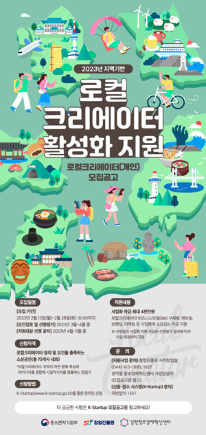 강원창조경제혁신센터(이하 강원혁신센터)는 '지역기반 로컬크리에이터 활성화 지원사업' 참가자를 28일까지 모집한다.로컬크리에이터는 지역의·자연 문화 특성과 아이디어를 결합해 사업 가치를 창출하는 창업가를 의미한다.본 사업은 중소벤처기업부, 창업진흥원과 함께 전국 6개(강원, 경기, 경북, 세종, 전남, 제주) 창조경제혁신센터에서 추진하는 창업 지원사업으로 강원 권역은 강원혁신센터에서 담당하여 사업을 운영한다. 모집분야는 두 가지로 ▲개인분야는 비즈니스 모델 구체화, 멘토링, 브랜딩, 마케팅 등 사업화에 소요되는 자금을 최대 4천만 원