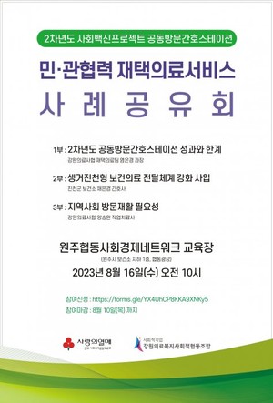 강원의료복지사회적협동조합(이하 강원의료사협)은 강원사회복지공동모금회에서 추진하는 '공동방문간호스테이션' 사업을 2년째 추진해 오고 있다. 공동방문간호스테이션은 거동이 불편하여 대면 진료를 받지 못하는 환자가 늘어나는 문제를 해결하기 위해 고안되었다. 최소 6개월 이상 대리 처방받는 환자의 집으로 방문 간호사가 직접 방문하여 혈액검사와 혈당 및 혈압을 체크하고 약 부작용과 복용 순응도, 건강 상태 등을 파악하여 의사에게 보고하는 프로그램이다. 강원의료사협에서는 오는 8월 16일에 사업 내용을 공유하는 자리를 마련했다. 오전 10시 원