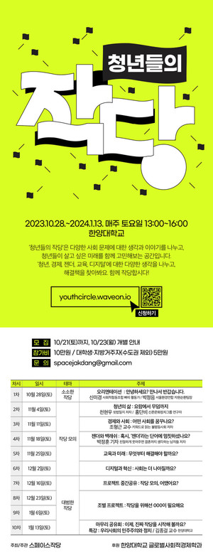스페이스작당이 오는 21일까지 청년들이 직접 문제에 대해 논의하고 행동하는 프로그램인 '청년들의 작당' 참가자를 모집한다.청년들의 작당은 다양한 사회문제에 대한 생각과 이야기를 나누고 청년들이 살고 싶은 미래를 함께 고민하고 해결하기 위해 기획됐다. 총 10회로 구성된 프로그램은 이달 28일부터 내년 1월 13일까지 매주 토요일에 진행한다. 다양한 사회 문제에 관심이 많거나 해결하고 싶은 사회 문제를 고민에서 끝내고 싶지 않은 사람을 비롯해 다양한 주제로 이야기를 나누고 싶은 사람이라면 누구나 참여 가능하다.주요 주제는 ▲청년의 삶