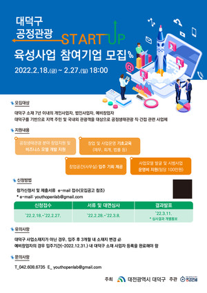 대전 대덕구가 2022년도 '공정관광 스타트업 육성사업'을 추진하고 멘토링에 참가할 기업을 27일까지 모집한다.이번 참가기업 모집은 대덕구 민선7기 대표공약인 공정·생태관광 육성사업의 일환으로 지역기반 관광업체들의 역량 강화 및 경영 안정화 지원을 위해 기획됐다. 공정관광·생태관광 분야로 확장이 가능한 대전광역시 대덕구에 사업장 소재지를 둔 창업 7년 미만의 기업 및 예비창업자를 대상으로 5개~10개 기업을 선정하여 집중적으로 지원할 예정이다.지원자격은 공고일 기준으로 대전광역시 대덕구에 소재지를 둔 창업 7년 미만의 관광관련 사업