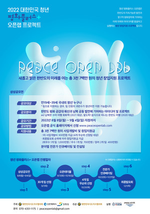 청년들이 스스로 남북한의 지속가능한 발전과 동북아 평화 정착을 위한 의제를 모색하도록 지원하는 '대한민국 청년 평화플러스 오픈랩'이 올해 역시 시행된다.대한민국시도지사협의회, 인천시, 강원도는 '2022 대한민국 청년 평화플러스 오픈랩'를 주최하며, 8일부터 참가자 모집을 시작했다고 밝혔다.본 사업은 한반도 평화공감대 확산과 남북 공동 발전에 기여하는 아이디어를 찾고 실행하는 '상상공모전'과 해당 아이디어를 온·오프라인 공론장을 통해 발전시키는 '오픈테이블'로 진행된다. '상상공모전'은 신청 마감 후 1개월 간 온·오프라인 공론장,