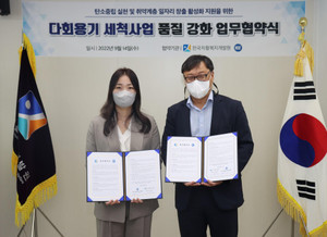 보건복지부 산하 한국자활복지개발원은 NSF Korea와 지난 14일 친환경 자활사업 업무 협약을 체결했다고 밝혔다.NSF International은 미국 비영리 인증 기관으로, 보건 안전과 환경 보호를 위한 규격 개발, 기술 교육 제공, 안전성 검토 등을 주 업무로 수행한다. 이번 업무 협약으로 한국자활복지개발원은 NSF와 협력해 '다회용기 세척사업'의 위생 품질을 강화할 예정이다. 다회용기 세척사업은 한국자활복지개발원이 집중적으로 육성하고 있는 친환경 자활사업이다. 탄소 중립 실천과 저소득 취약계층 일자리 창출을 위해 진행되고 있