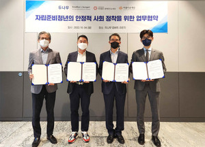 함께만드는세상(사회연대은행)은 블록체인 및 핀테크 전문기업 두나무를 비롯해 아름다운재단, 브라더스키퍼 등과 함께 자립준비청년의 체계적인 지원을 위해 4자간 업무협약을 체결했다고 5일 밝혔다.이번 협약으로 사회연대은행, 두나무, 브라더스키퍼, 아름다운재단은 각 사 및 기관의 전문성을 활용해 자립준비청년들이 삶을 주체적으로 만들어 갈 수 있도록 적극 협력하기로 약속했다.특히 이들이 사회 구성원으로 정착할 때까지 생애 주기에 따른 통합적인 지원 방안을 마련해 △사회 정착 초기에는 아름다운재단이 ‘교육비, 생활 안정자금, 커뮤니티 활동’