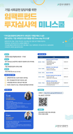 한국사회투자가 기업 사회공헌 담당자를 위한 '임팩트펀드 투자심사역 미니스쿨'을 개최한다. '임팩트펀드 투자심사역 미니스쿨'은 오는 27일 'SKT 스타트업 랩(Startup Lab) 을지로'(서울 중구 소재)에서 열릴 예정이다. 이번 행사는 기부 기반 임팩트투자 사회공헌 프로그램 기획에 관심 있는 기업 사회공헌 담당자(CSR, ESG, 지속가능경영 등 유관부서 포함)를 대상으로 하며, 임팩트투자 개념, 기부금 기반 펀드 조성 방법, 펀드 운용 실무 역량을 지원하기 위해 기획됐다. 사회공헌 담당자 대상 맞춤형 교육을 통해 임팩트투자에