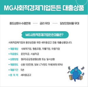 새마을금고는 사회적경제기업에 우대혜택을 제공하는 'MG사회적경제 기업든든대출'을 출시했다고 28일 밝혔다.'MG사회적경제기업든든대출'은 사회적 가치와 재무적 이익을 함께 추구하는 사회적경제기업(사회적기업, 협동조합, 마을기업, 자활기업)을 대상으로 대출한도와 수수료 등을 우대 지원해 금융비용을 절감할 수 있는 상품이다.부동산 담보대출 시 담보인정비율은 최대 85%까지 우대하고, 중도상환수수료 면제 혜택 등을 제공한다.이번 신상품은 내달 2일부터 4일까지 광주 김대중컨벤션센터에서 개최되는 제3회 대한민국 사회적경제박람회에서도 판매된다