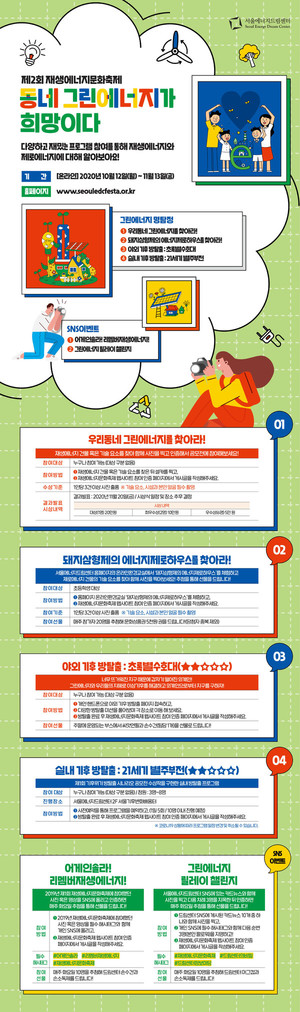 서울시의 에너지환경 체험교육전시관인 서울에너지드림센터가 제2회 재생에너지 문화축제 '동네 그린에너지가 희망이다'가 오는 11월 13일까지 온라인으로 진행된다.서울에너지드림센터는 대표적 제로에너지 건축물로, 기후위기 대응을 위해 시민들이 시민참여 프로그램을 진행하고 있다.올해의 재생에너지 문화축제는 코로나19 감염 예방 및 확산 방지를 위해 전시관을 오지 않아도 참여할 수 있는 온라인 축제로 확대했다. 태양광, 풍력, 지열 등 재생에너지는 에너지드림센터에서 해설과 체험이 가능하다.축제 프로그램은 '우리동네 그린에너지를 찾아라!, '돼