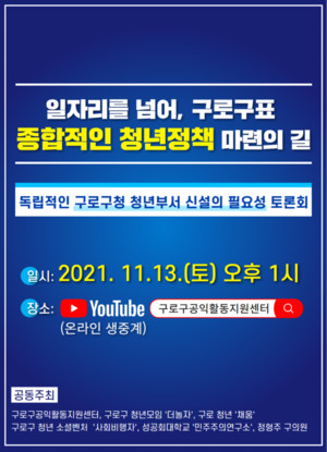 성공회대학교 민주주의연구소(소장 김동춘)와 구로구 지역 청년들이 청년정책 마련에 대한 토론회를 공동 주최한다.성공회대 측은 "오는 13일 토요일 오후 1시 구로구 지역 청년들과 '일자리를 넘어, 구로구표 종합적인 청년정책 마련의길: 독립적인 구로구청 청년부서 신설의 필요성' 토론회를 공동주최한다"고 밝혔다.이번 청년토론회는 구로구 지역활동가들을 지원해주는 '구로구공익활동지원센터'의 유튜브 채널(채널명: 구로구공익활동지원센터)를 통해 생중계된다.토론회는 청년전담부서를 통한 종합적인 청년정책 마련이라는 대한민국 청년정책의 흐름을 살펴보