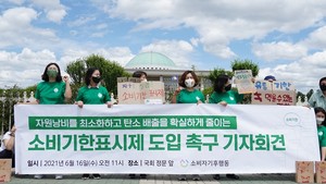16일, ▲(사)소비자기후행동, ▲아이쿱생협연합회, ▲자원순환사회연대, ▲환경운동연합 등 시민단체 주최로 '소비기한표시제 도입 촉구 기자회견'이 진행됐다. 소비기한은 섭취해도 건강에 해가 없다고 판단되는 최종기한이다. 실제 먹을 수 있는 기한에 비해 유통기한은 짧다. 소비기한표시제는 식품 낭비를 줄이고 탄소 발생, 사회적 비용을 줄일 수 있다는 장점으로 미국, 호주, 일본, 중국, 필리핀, 케냐 등 여러 나라에서 채택한 제도이다. 소비기한표시제는 지난 1월부터 전국 시민들의 서명운동, 릴레이 캠페인 등을 통해 도입을 요구했다. 5월
