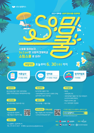 LG소셜캠퍼스가 '소밈스쿨'을 진행한다. 소밈(Meme)스쿨은 사회적경제와 친환경의 가치를 배우고 행동하는 인재를 양성하기 위해 대학생 사회적경제 활동 프로젝트다.밈(Meme)은 모방을 뜻하는 그리스어 '미메시스(Mimesis)'와 '유전자'(Gene)의 합성어로, 영국의 생물학자 리처드 도킨스가 1976년에 '이기적 유전자'란 저서를 출간하며 만들어낸 개념이다. 문화의 전달에도 유전자 같은 중간 매개물이 필요한데 이 역할을 하는 정보의 형식이 밈이다. 소밈스쿨에 선발된 대학생들은 8월~12월까지 약 5개월간 팀별 프로젝트 활동비를