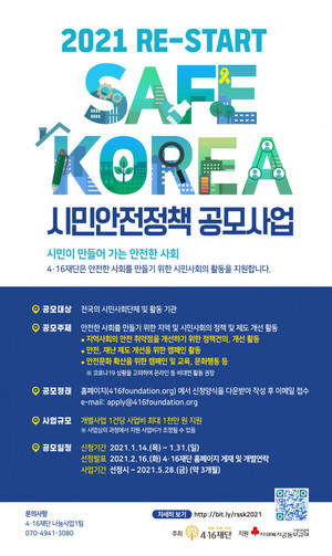 4.16세월호참사 피해 가족과 국민의 안전 사회를 위해 만든 4·16재단이 사회복지공동모금회 지원을 받아 'RE-START SAFE KOREA 시민안전정책 공모사업'을 진행한다.이번 사업의 공모 주제는 '안전 사회를 만들기 위한 지역 및 시민 사회의 정책·제도 개선 활동'이다. 사업 계획서를 제출하면 심사를 통해 1억 1000만원 지원 한도 안에서 단체를 선발할 예정이다. 2019년부터 계속되고 있는 이 사업은 전국 시민·사회단체 및 활동 기관들이 지원할 수 있다. 선발된 단체는 5월 31일까지 최대 1000만원의 사업 활동 비용을