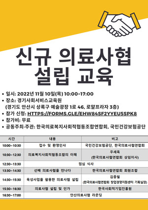 한국의료복지사회적협동조합연합회(이하 의료사협연합회)는 국민건강보험공단(이하 건보공단)과 공동 주최로 11월 10일 오전 10시부터 오후 5시까지 경기도사회서비스교육원(안산)에서 2022년 신규 의료복지사회적협동조합 설립 교육을 실시한다. 자신이 살고있는 동네, 마을에서 건강하게 행복하게 살아가고자 하는 염원을 해결하고자 협동하고, 자신의 건강을 살피는 일을 물론 이웃의 건강까지 서로 살피는 문화와 공동체를 원하는 사람들이 다가오는 초고령사회에 관심을 많이 가지고 최근 의료복지사회적협동조합을 주목한다. 본 신규 의료사협 설립 교육은