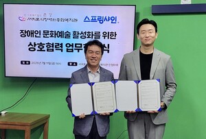 발달장애인 예술가의 발굴과 육성을 전문으로 하는 사회적기업 스프링샤인이 서귀포시장애인종합복지관과 발달장애 예술인의 일자리 창출 및 예술 활동 지원을 위한 업무협약을 체결했다.이번 협약은 발달장애 예술인의 창작 역량을 발굴하고 사회적 일자리를 확대하며, 지역 내 장애 인식 개선과 문화 다양성 증진에 기여하기 위한 공동 노력의 일환으로 추진됐다. 양 기관은 ▲발달장애 예술인의 일자리 창출을 위한 협력 ▲예술 아카데미 및 아트마켓 운영 지원 ▲아트굿즈 등 예술 콘텐츠 기반 사업 추진 등 다양한 분야에서 협력할 예정이다. 더불어 지역 기반