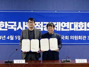 녹색정의당과 한국사회적경제연대회의(이하 연대회의)가 사회연대경제 활성화를 위한 정책 협약식을 25일 오전 국회본관에서 가졌다.올해 1월 취임한 김경민 연대회의 상임대표는 "윤석열 정부가 들어오면서 (사회연대경제)예산을 극단적으로 깎아버려서 지금이야말로 사회적경제가 자기 자신을 되돌아보고 우리의 정치적 효과까지도 설계해야 하는 시점"이라며 "녹색정의당과 함께 앞으로 계속 사회적경제와 한국 민주주의, 다양한 한국 사회 사례를 해결하는 데에 동행하면 좋겠다"고 말했다. 협약 내용은 연대회의가 제시한 '사회적경제 입법·활성화 관련 10대
