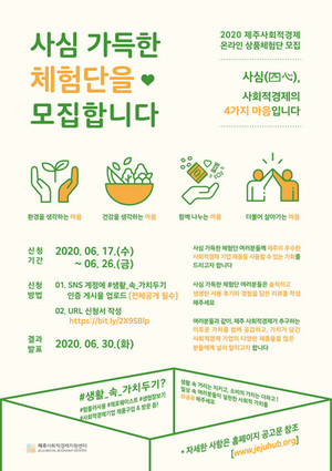 제주특별자치도사회적경제지원센터는 올해 두번째로 추진되는 '2020 제주사회적경제 상품체험단 운영사업'의 일환으로 사회적경제 기업 제품을 직접 사용하고 품질을 접하는 '사심 가득한 상품체험단'을 모집한다고 18일 밝혔다.'사심 가득한 상품체험단'의 '사심(四心)'은 ▲환경을 생각하는 마음 ▲건강을 생각하는 마음 ▲함께 나누는 마음 ▲더불어 살아가는 마음으로 제주 사회적경제가 추구하는 네 가지 마음을 담았다는 의미를 담고 있다.상품체험단은 제주 사회적경제 기업 제품 4종과 가치 굿즈가 담긴 '사심(四心)박스'를 제공받게 되며, 제품에