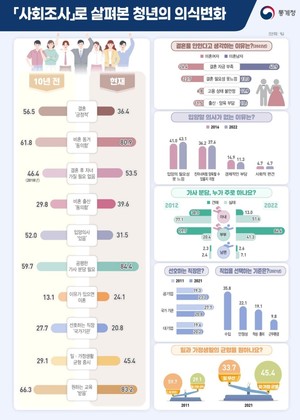 결혼에 대해 긍정적으로 생각하는 청년이 3명중 1명으로 줄어들었다. 10년 전보다 20% 넘게 줄어든 것이다. 그러나 10명 중 8명의 청년은 결혼하지 않더라도 같이 살 수 있다고 응답했다. 결혼하지 않는 가장 큰 이유는 '결혼자금 부족'으로 조사됐고 청년 절반 이상은 결혼을 하더라도 자녀를 가질 필요가 없다고 웅답했다.통계청은 28일 이같은 내용을 담은 '사회조사로 살펴본 청년의 의식변화'를 발표했다. 보고서는 19~34세 청년을 대상으로 지난 10년간 청년의 결혼·출산·노동 등에 대한 가치관이 어떻게 변화했는지를 분석했다.우선