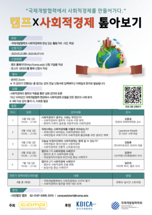 '지역의 빈곤 문제 해결과 지역사회 자립'을 목표로 필리핀에서 10년간 활동하고 있는 국제개발협력 NGO 사단법인 캠프(CAMP)에서 '캠프x사회적경제 톺아보기' 프로그램에 함께할 참가자를 모집한다. 프로그램은 온라인 zoom으로 진행되며, 국제개발협력과 사회적경제에 관심이 있다면 누구나 참여 가능하다. 주요 내용은 ▲사회적경제의 철학과 적용 ▲국제개발협력에서의 사회적경제 ▲캠프의 사회적경제 사례 분석 등을 다루고 강의와 토론 형식으로 진행된다. 모집은 6월 7일까지로 포스터의 QR코드나 신청링크를 통해 신청서를 작성하면 된다. 프